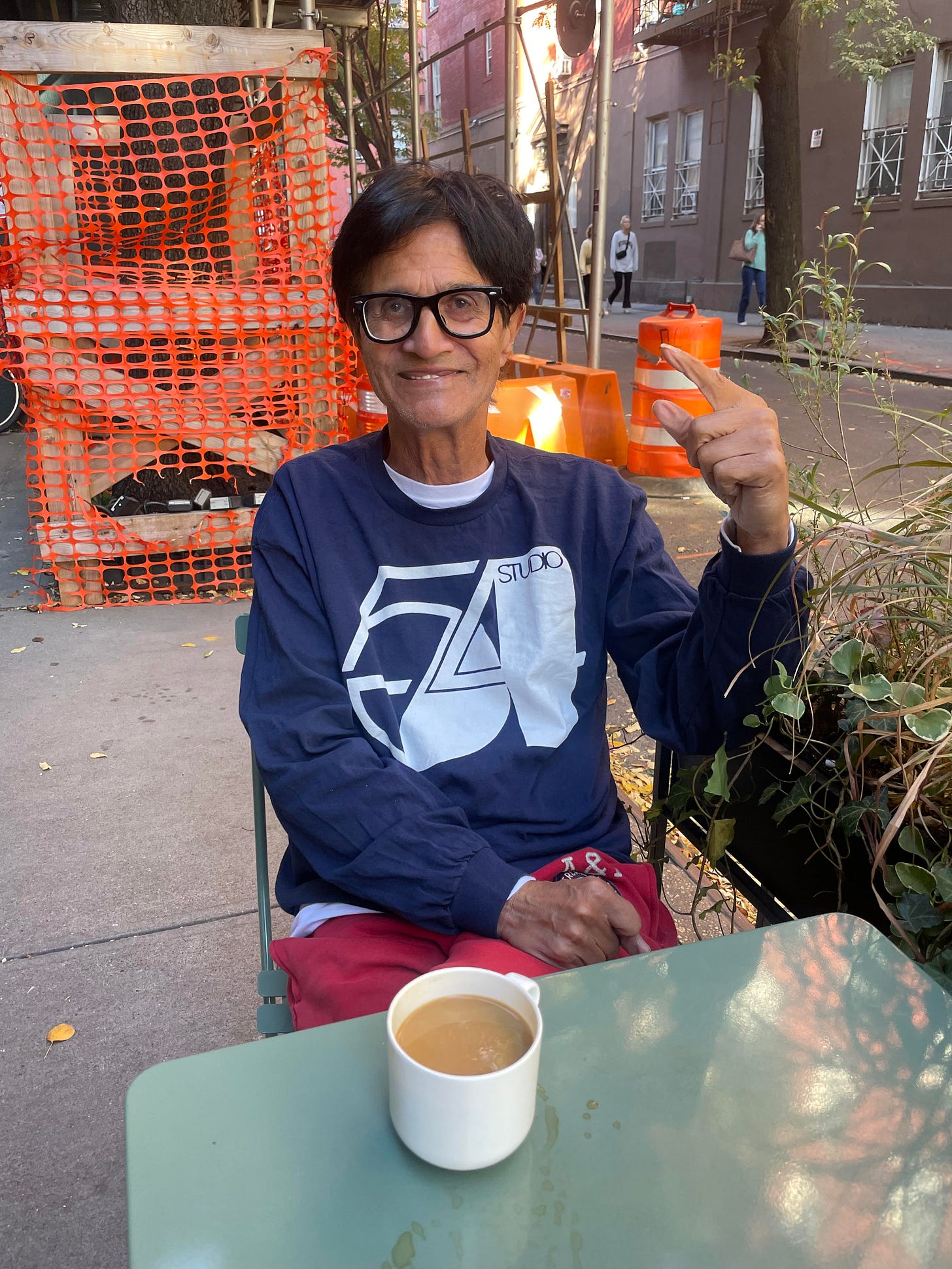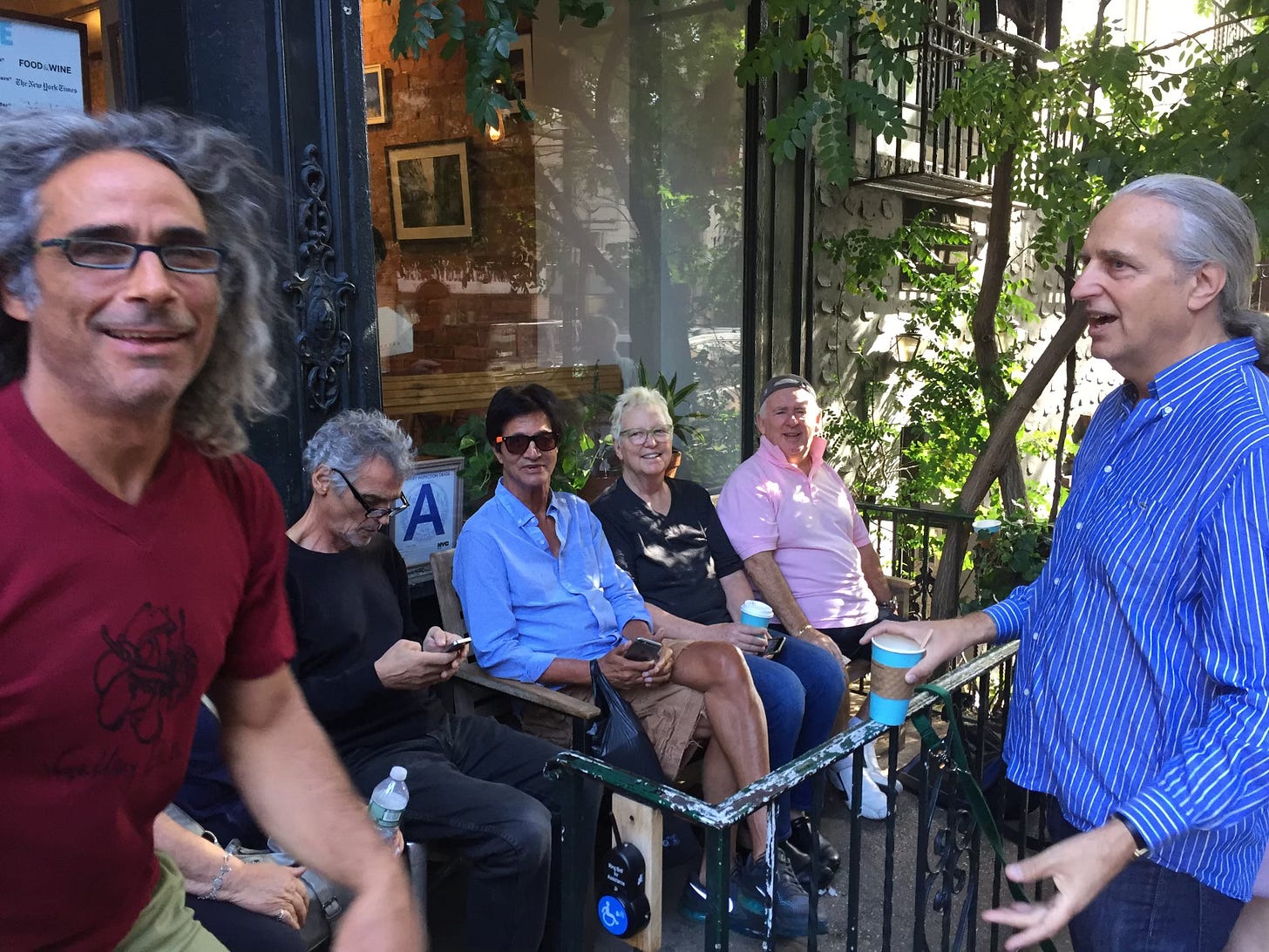 Arnie, sitting outside Radiant Coffee Shop in the West Village.
